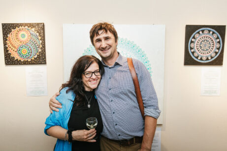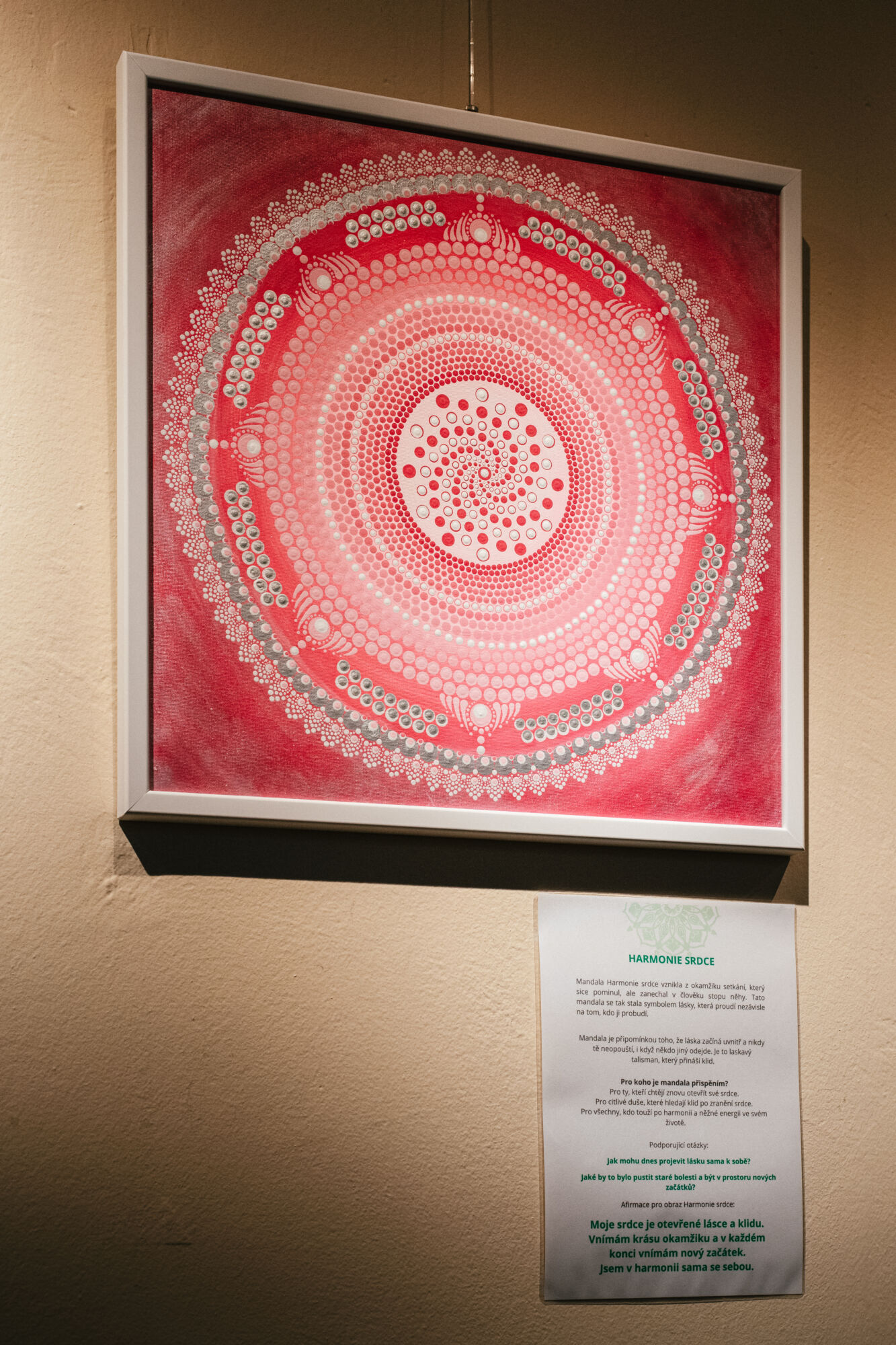 Samotná vernisáž byla taky plná pohody a radosti. Tolik úsměvů, které jsem viděla. Hlavou mi stále procházelo slovo Děkuji. Děkuji, že můžu. Děkuji, že můžu a chci. Děkuji, že jsem se rozhodla rozdávat radost. Děkuji, že jsou lidé, kteří se chtějí radovat. Děkuji vedení kina, Regině Szpyrcové, že mi dala možnost obrazy vystavit, děkuji Terezce Vlčkové z kina, že mi pomohla s instalací výstavy, děkuji Lucce Šloufové, která se mnou, i na dálku, vše krásně připravovala. Děkuji rodině Czudkových za zapůjčení jejich rodinné mandaly, kterou jsem jim před dvěma lety vytvořila na míru. Děkuji, že některé z mandalek hned první den výstavy našly svého nového majitele a děkuji všem, kteří na vernisáž zavítali.